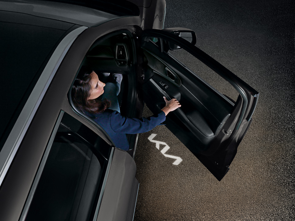 Beginne jede Nachtfahrt mit einer besondere Note: Wenn du bei Dunkelheit die Tür öffnest, werden die scharfen Konturen des Kia Logos auf den Boden projiziert.